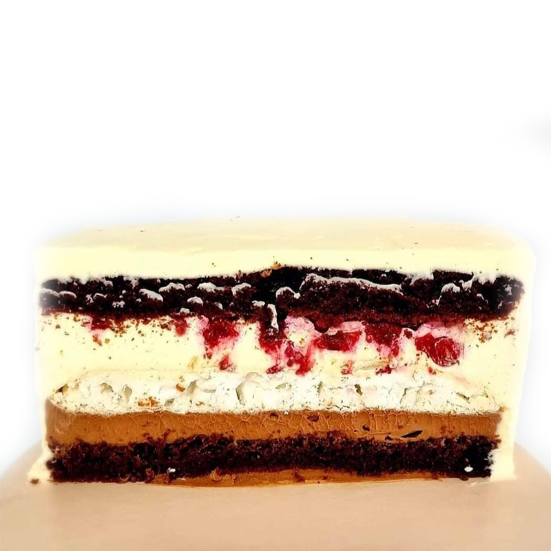 Blaturi cu cacao, blat bezea, crema ciocolată, cremos ciocolata albă și mascarpone, compotee cu fructe de pădure