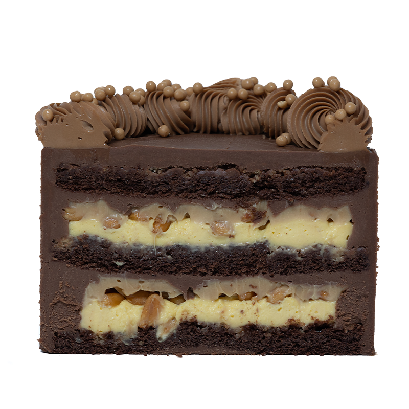 Blaturi cu cacao și streussel cu alune de pădure, cremos ciocolată albă și vanilie, caramel, arahide sărate și ganache cu ciocolată